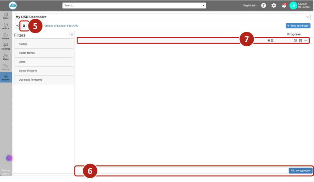 Klik in het menu “Rapporten” op “Nieuw dashboard . Voer een naam in voor je dashboard en selecteer het dashboardtype “OKR” in het vervolgkeuzemenu .