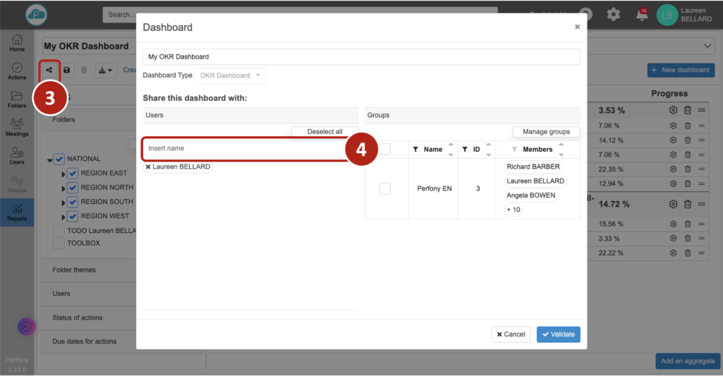 Het pictogram Delen opent een popup om de namen in te voeren (of te verwijderen) van de gebruikers met wie je het dashboard wilt delen, of selecteer een groep die al geconfigureerd is in het menu “Groepen”.