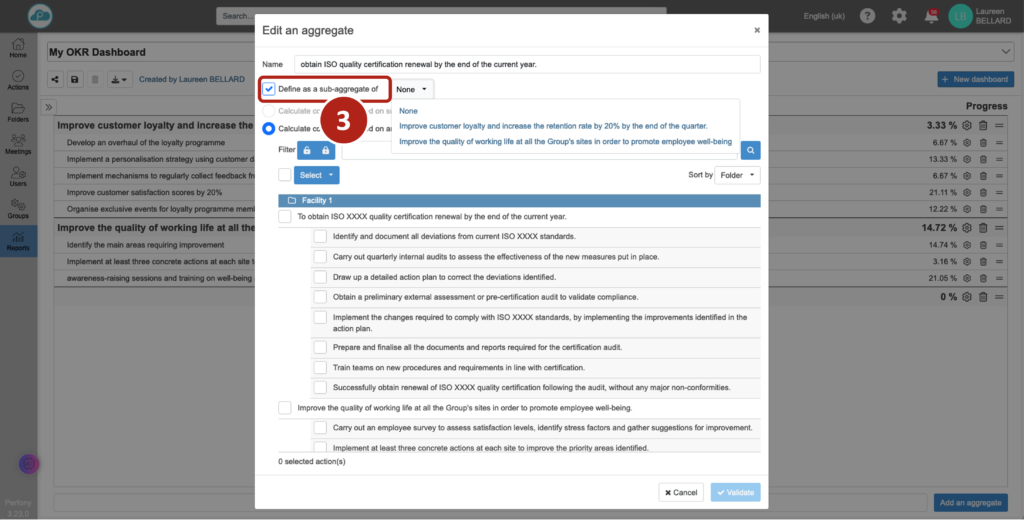 Als het aggregaat wordt berekend op basis van de voortgang van de acties, kunnen we ze nu selecteren. Alle acties in de mappen waartoe we toegang hebben, worden weergegeven. Je kunt ervoor kiezen om de weergave te beperken door acties te filteren op basis van hun vergrendelingsniveau (begrijp de functionaliteit voor het vergrendelen van acties).