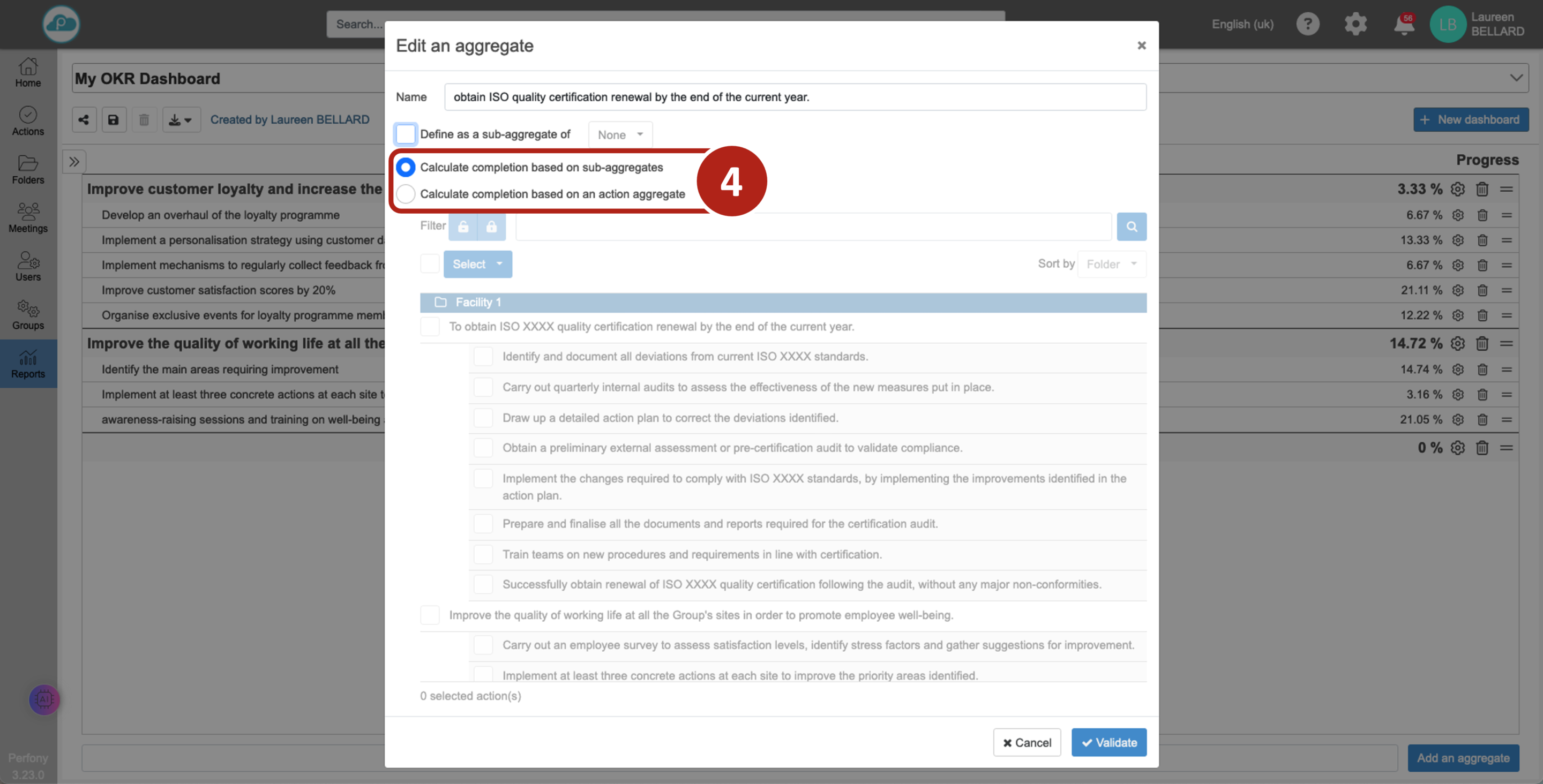 Als het aggregaat geen subaggregaat is, kun je kiezen hoe je de voortgang wilt berekenen : uit de voortgang van de subaggregaten of uit de voortgang van de acties.