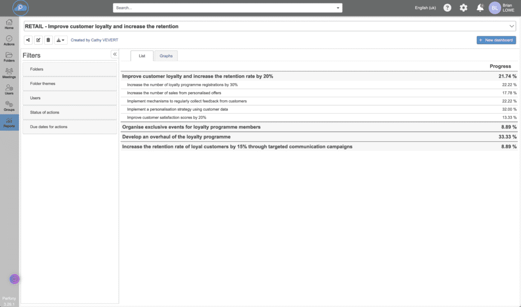 Je OKR’s in Perfony zijn beschikbaar en worden automatisch bijgewerkt in de vorm van lijsten en grafieken.