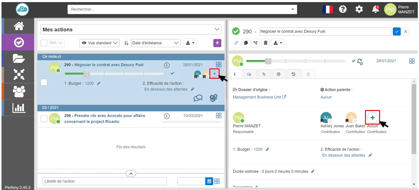 Adicionar, modificar e excluir um ou mais colaboradores de uma ação é possível a qualquer momento para todos os membros da pasta à qual esta ação está anexada.