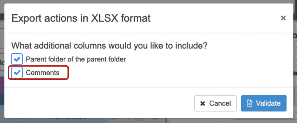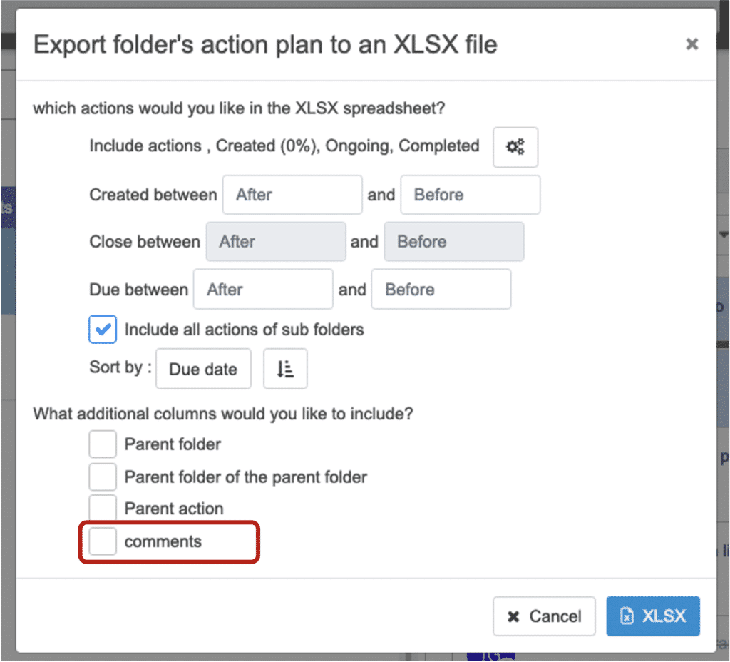 Uma janela pop-up lhe dá várias opções para exportar as ações do seu arquivo em formato.xls. Selecione”Comments” (Comentários) para adicionar uma coluna com o fluxo de comentários anexados às ações e clique no botão . anexado às ações e clique no arquivo.XLSX para obter o arquivo.