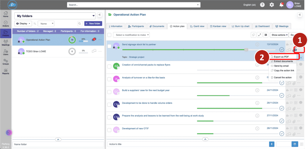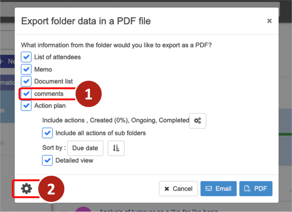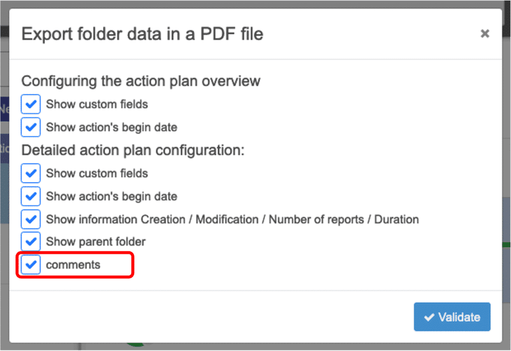 No menu de uma ação , clique em”Exportar pdf”. Uma janela pop-up será aberta mostrando as informações disponíveis para exportação. Clique em”Comments” (Comentários) e depoisem “Validate” (Validar ) e você obterá o arquivo .pdf com as informações selecionadas.