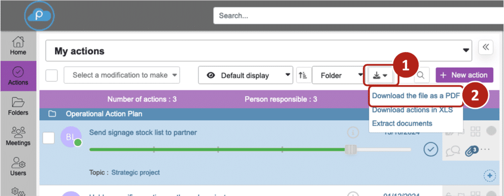 Também é possível extrair os comentários do menu”Actions” (Ações). Clique no ícone de download e selecione”baixar ações em XLS”.